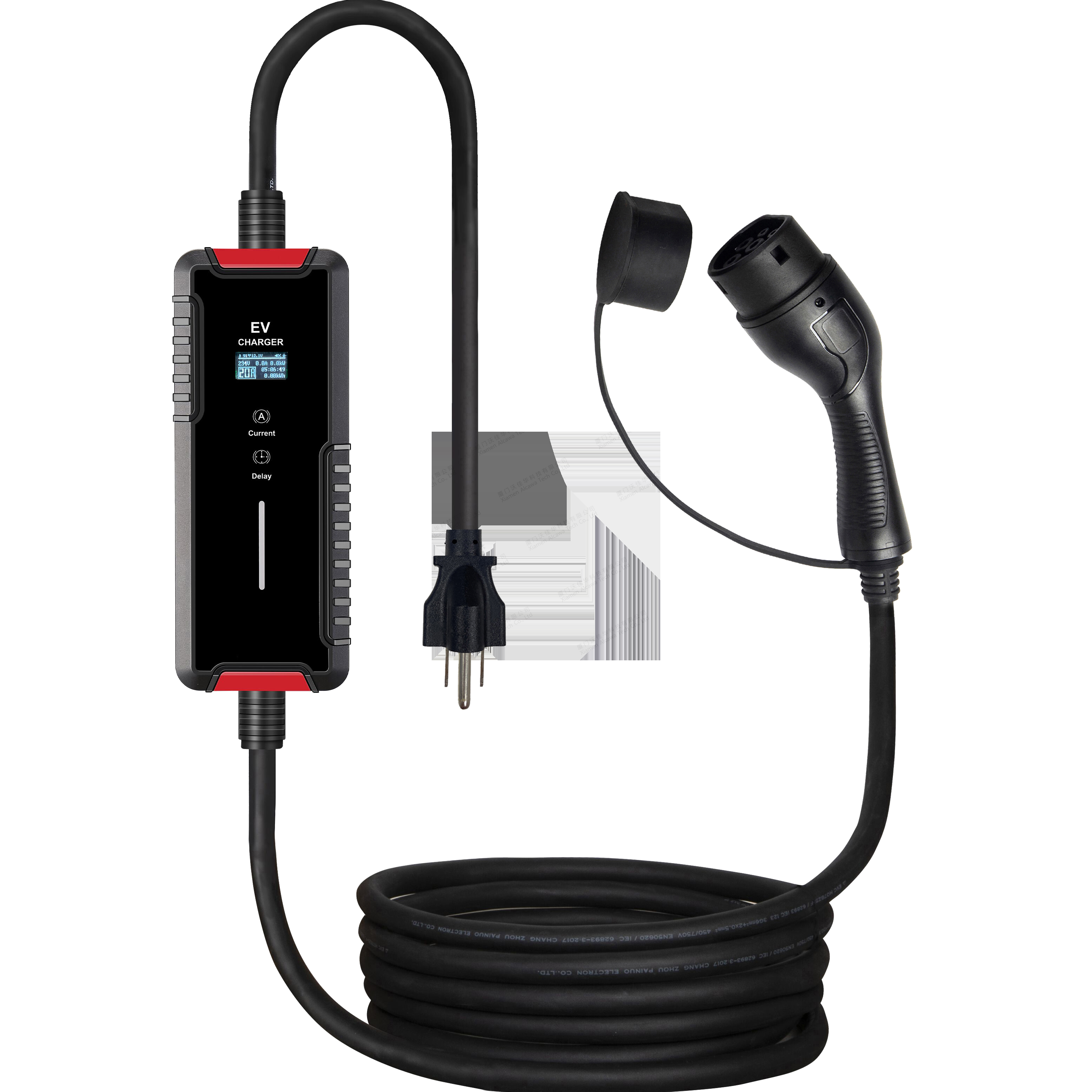 EU STANDARD: 1. Portable EV Charger, CE(EN62752), UKCA, RoHS, TUV, CB 2. Type 2 EV charging cable TPU jacket (CE EN62196 /TUV certified) 3. OLED screen & Indicator Light to show work situation(R/G/B) 4. RCD: 30mA AC; ST MCU chipset; 5. IP65, Weather proof; Leakage current protection; Impact resistance, Over current protection, Ground protection, Surge protection, O/U voltage protection, O/U frequency protection, Over temp protection 6. 16A with BS/Schukoplug, 32A with blue CEE plug; with Thermal sensor 7. Shell by thermoplastic PC94V-0, abrasion protection 8. with current switch button / delay button NA STANDARD: 1. Portable EV Charger, FCC, RoHS, ETL(UL2594) 2. Type 1 EV charging cable TPE jacket (UL certified and listed) 3. OLED screen & Indicator Light to show work situation(R/G/B) 4. RCD protection: CCID20 5. Type 6, Weather proof; Leakage current protection; Impact resistance, Over current protection, Ground protection, Surge protection, O/U voltage protection, O/U frequency protection, Over temp protection 6. Shell by thermoplastic PC94V-0, abrasion protection 7. with current switch button / delay button