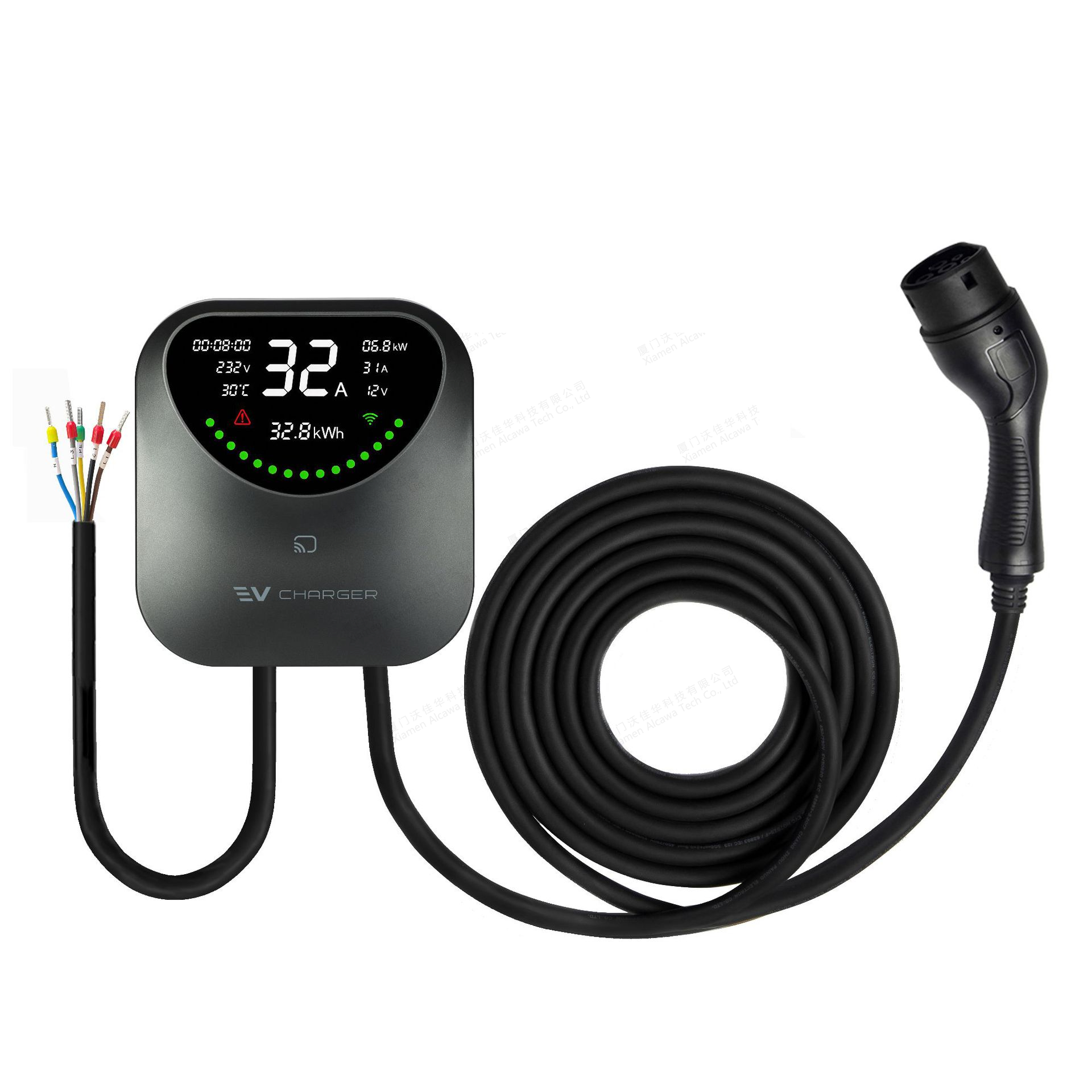This product is a AC charging station, mainly used for AC charging of electric vehicles. The product iscomposed of charging station body, wall-hanging backboard, floor-to-ground column (optional), etc.with charging protection, charging by swiping card. This product adopts industrial design principle, easy toinstall and easy to use. Exterior: Exquisite and light, a variety of color options, suitable for diferent application scenarios.Protection: level of protection lP65(waterproof and dust-proof), can withstand wind, rain and sunexposure. Operation: The head of the charger is designed to open the cover with one botton. The operation issimple and convenient, namely plug and play. Safety: multiple protection, safety upgrade, high quality materials, fireproof, waterproof and dust-proof. Commonality: Small boby, big energy, compatible with 99% of the new energy vehicles. Quality: Pure copper wire without oxidation, comply with inspection standard, flame retardant impactresistance.